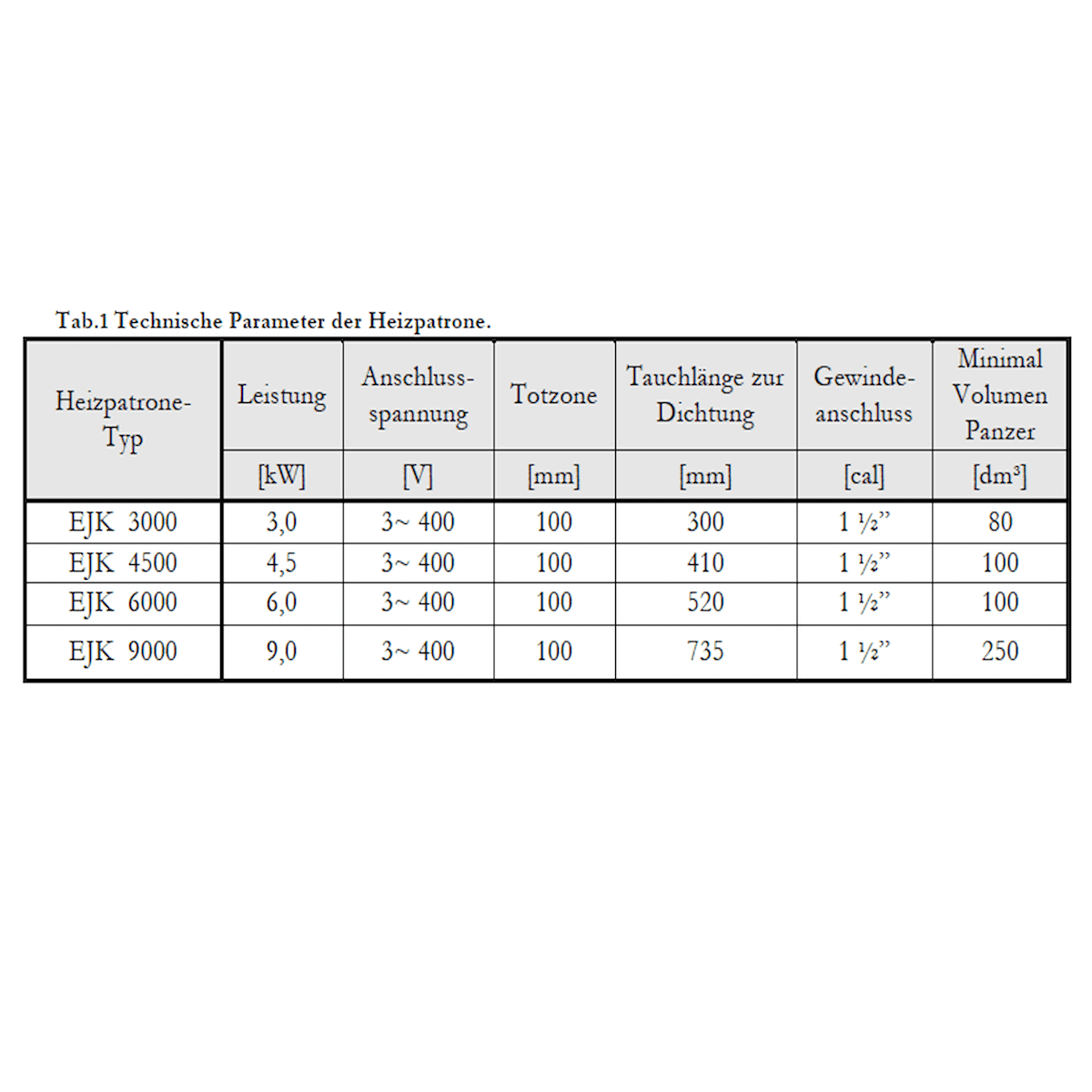 The heating element has a connection with 1 1/2" External thread (AG) and fits into standard domestic hot water and drinking water storage tanks. Thanks to its compact installation length of 520 mm and an unheated length of 100 mm, the heating cartridge can be integrated quickly and easily. The included 1.5-meter connection cable guarantees a straightforward and direct power supply.