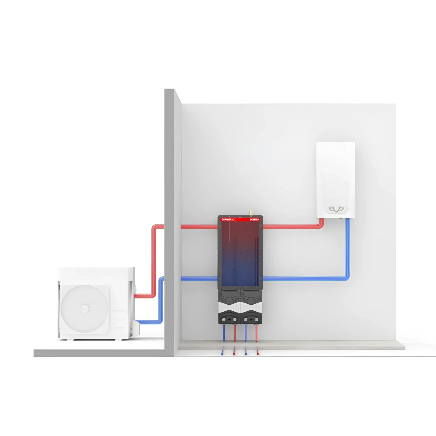 Whether as a buffer tank in heating systems, as a hydraulic separator, or as a distributor for up to two circuits – the Lovato Bomber 50 C covers a wide range of application scenarios. Its ultra-flat design saves valuable space, while the sophisticated interior architecture ensures even layering and high efficiency.