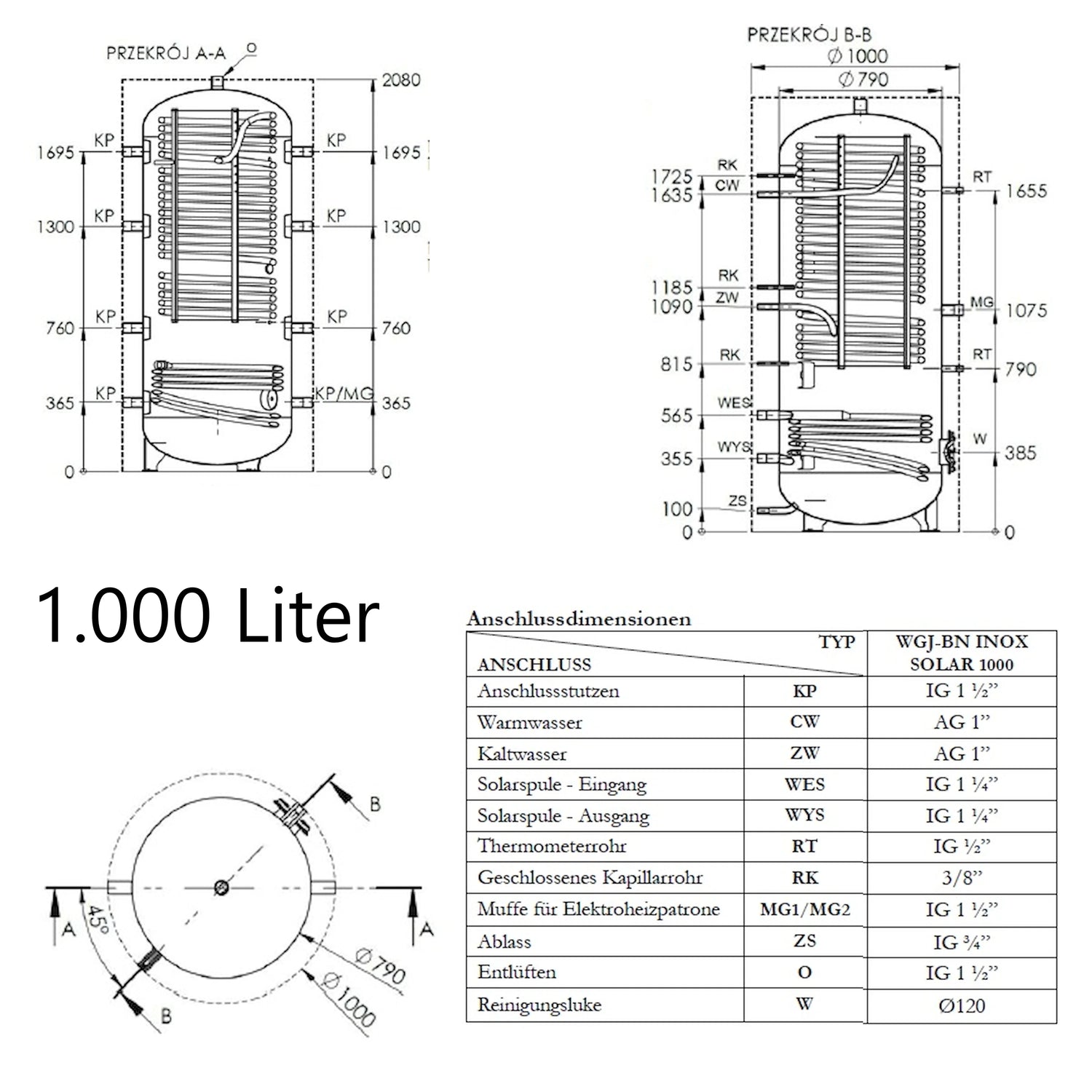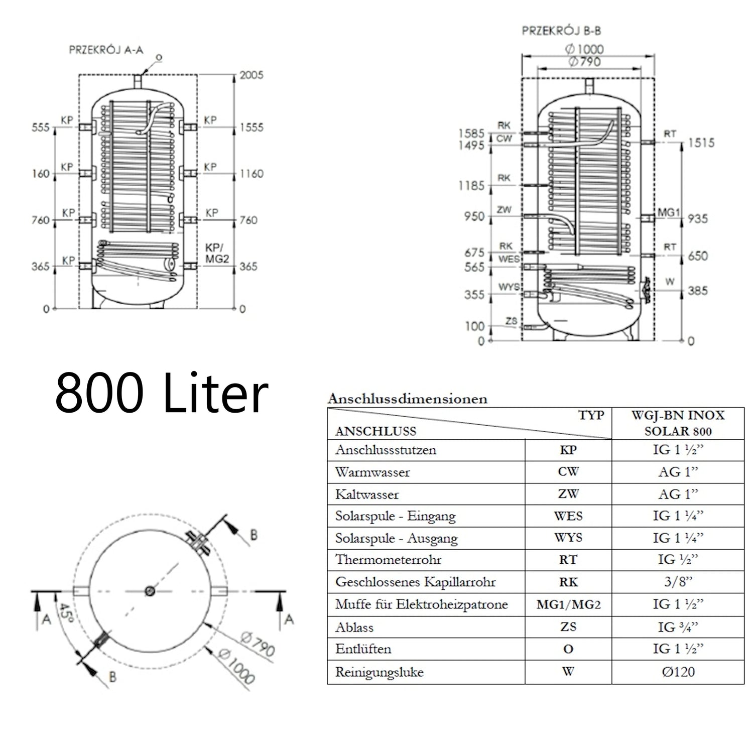Le WGJ-BN INOX SOLAR est un ballon tampon combiné pour la production d'eau chaude sanitaire et d'eau de chauffage, doté d'un serpentin de chauffage en acier inoxydable intégré servant d'échangeur de chaleur. Conçu pour être intégré à des systèmes de chauffage central avec chaudières, pompes à chaleur ou pour l'utilisation de l'énergie solaire, il permet à la fois le stockage d'énergie thermique et la production continue d'eau potable.