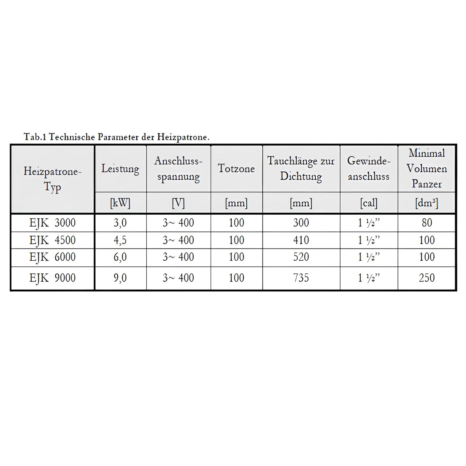 La cartuccia riscaldante del pacchetto completo è disponibile in diverse classi di potenza, specificamente progettate per 1,5 kW, 2,0 kW, 3,0 kW a 230 V e 4,5 kW, 6,0 kW e 9,0 kW a 400 V. Queste varianti consentono un adattamento ottimale al fabbisogno energetico individuale dell'impianto di riscaldamento.