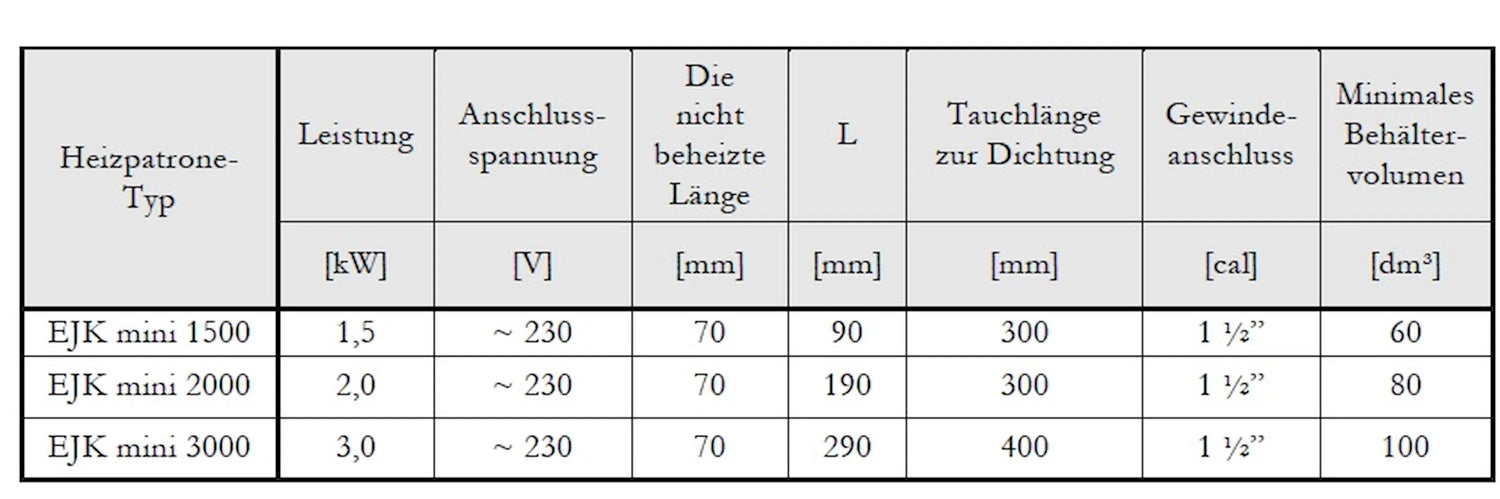 Sildelementam ir savienojums ar 1 1/2" Tam ir ārējā vītne (AG) un tas der standarta karstā ūdens un dzeramā ūdens uzglabāšanas tvertnēm. Pateicoties kompaktajam uzstādīšanas garumam 400 mm un neapsildāmā stāvokļa garumam 70 mm, sildīšanas kasetni var ātri un vienkārši integrēt. Komplektā iekļautais 1,5 metru savienojuma kabelis garantē vienkāršu un tiešu barošanas avotu.