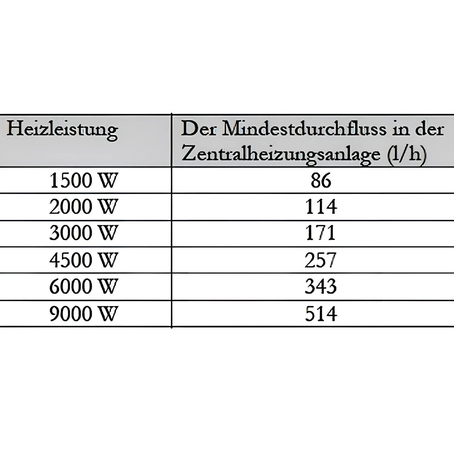 Centrālās apkures sistēmām paredzētajam momentānajam ūdens sildītājam ir precīzas pieslēgšanas iespējas: Turpgaitas un atgaitas savienojuma izmēri ir 1 1/4" IG, savukārt sildelementa savienojums ir iestatīts uz 1 1/2" IG. Tas sasniedz maksimāli pieļaujamo darba temperatūru 90 °C un droši darbojas līdz darba spiedienam 10 bar.
