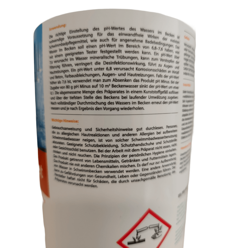 Ar pH Minus 1,5 kg jūs iegūstat produktu, kas precīzi pielāgo pH līmeni jūsu baseina ūdenī. Tas darbojas ātri, ātri izšķīst un piedāvā drošu lietošanu, ļaujot baudīt patīkamu peldēšanās pieredzi jau dažas stundas pēc apstrādes. Šis produkts ir īpaši izstrādāts, lai efektīvi pazeminātu pH līmeni, ja tas tiek mērīts pārmērīgi, neapdraudot ūdens kvalitāti vai izmantotos produktus.