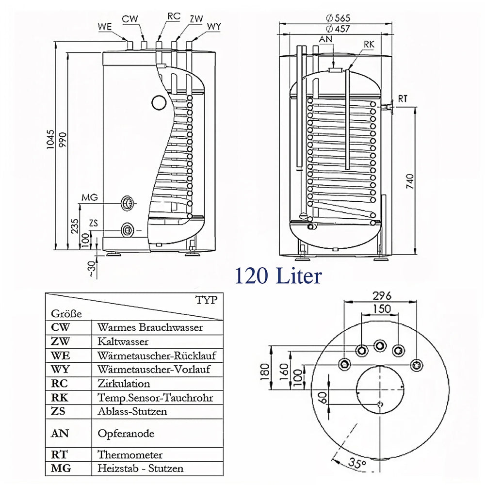 Ten Zbiornik na gorącą wodę z 120 litrów Volumen zachwyca centralnym i bezpiecznym podgrzewaniem ciepłej wody użytkowej, co idealnie zaspokaja codzienne zapotrzebowanie na ciepłą i woda pitna Wyposażony w zintegrowany wymiennik ciepła, zapewnia niezawodną pracę Woda użytkowa i wody pitnej, łącząc komfort i wydajność w jednym urządzeniu.