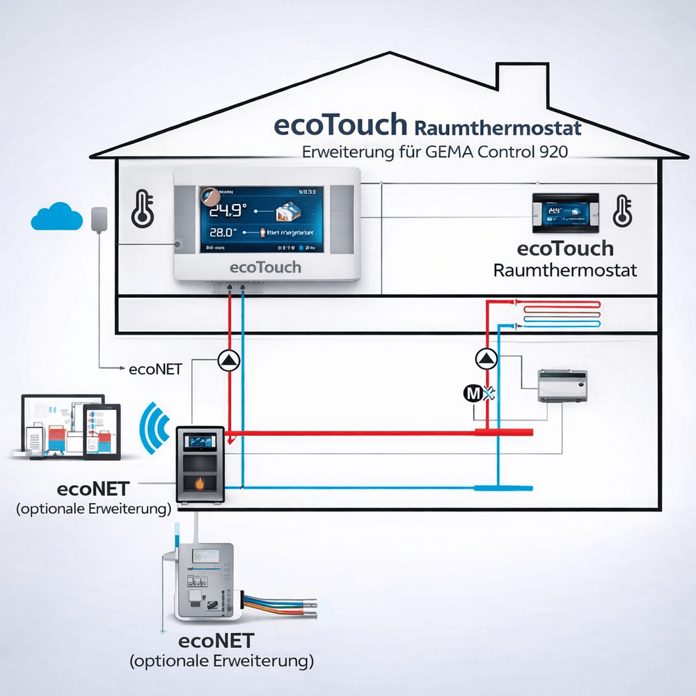 S sobnim termostatom PLUM eco Touch znatno razširite zmogljivosti vašega sistema za regulacijo ogrevanja Gema CONTROL 920. Idealen je za gospodinjstva, ki potrebujejo natančnejši nadzor temperature ali nadzor več prostorov. Ta razširitev ne le izboljša bivalno udobje, temveč tudi pomaga optimizirati porabo energije, saj omogoča natančno prilagajanje temperature vašim potrebam.